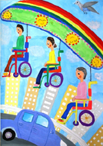 | 未来の都市の車いすは、ペガサスがどこにでも連れて行ってくれて、大空への散歩もしてくれます。みんなにやさしい世界です。 |