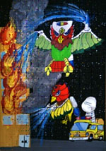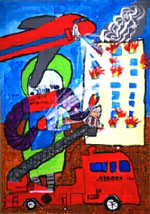 | 消防ロボットがお腹のタンクの水を噴き出してみんなを助けるよ。 |